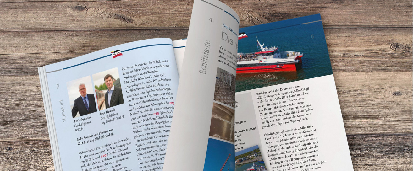 Für Sie ziehen wir unsere besten Seiten auf! In unserem Kundenmagazin „Ruderblatt“, halten wir Sie über aktuelle Entwicklungen bei der W.D.R. auf dem Laufenden.